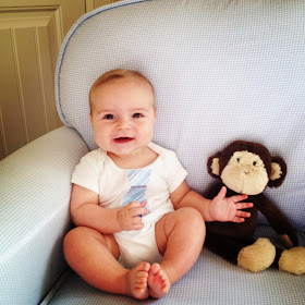 This past month our little guy has changed SO MUCH! He's really packing on the lbs lately. He's totally filling out six months clothes. We'll be in nine months here pretty quickly. He's definitely rolling all over the place, desperately trying to get his knees up under him to get in four point. A little bit to go before he masters this, but I'd be lying if I said I wasn't feeling a little unprepared to have a mobile child! We've slowly been introducing foods and so far, he hates the first 1-3 bites, then can't eat the rest of it fast enough. He's a wild man! It's quite refreshing to have a kid who loves to eat! I love watching him explore visually and with his hands. He studies everything very intently and you can practically see his wheels spinning. He's enjoying his exersaucer and Johnny Jump-Up. In just the past week, he's learned how to "jump", basically just bouncing up and down but he seems pretty impressed by it. Our Cal is all smiles and really hams it up for Mom. He'll stare at you until you look at him, then give you a flirty toothless grin. I find it totally irresistible! What a sweet pea this one is!