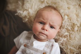 Cal is doing great....growing like a weed. He's rolling all over the place. We put him square in the middle of his blanket and the next thing we know, he's half way across the room, on his belly facing the opposite direction. Movement is quite foreign to us around the Hinton house! It's amazing to see him in action..I can only imagine what's to come! He's as happy as can be, though he still loves to rock his famous "scowl". It's a relief that we are now getting more toothless grins and giggles these days than his stare down! We got his three month pictures done back in early August, and I'm just now getting around to showing you all, but they're pretty darn cute. They capture his personality pretty well at that age.