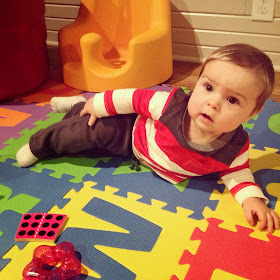 The day after Christmas was Cal's eight month birthday. Time really is flying by. I'm going to be planning a first birthday party before I know it! For now, he is keeping us all on our toes. He is moving all over the place. He can get up on all fours and move, but he really prefers the army crawl as it's most effective for him. Just yesterday I watched him crawl then move himself into a sitting position, a new move for him! He had just been able to lay on his side and prop, not fully sit. He is literally changing every day. Eating is still a favorite for him. He seems to be getting his "pincher" grip down and is able to pick up some foods and feed himself. He's still not that comfortable with different textures yet though.