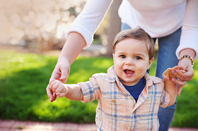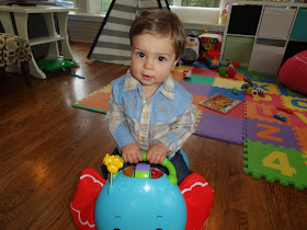 Even though we had to work overtime to get him to smile initially, he loves to smile, giggle and ham it up at every chance.  He's a busy boy who loves to play and move.  He pushes his elephant all over this house, maneuvering around every piece of furniture with ease.  Just like his sister, he thinks most silly noises are hilarious.  And fittingly, we've officially determined that his first word is "achoo".  If you know our family well, then you'd know that sneezes are a a big deal around here.  Elena giggles uncontrollably any time anyone sneezes, so appropriately Cal now says "Achoo" and laughs, proving this sweet little guy is a perfect piece to our family!
